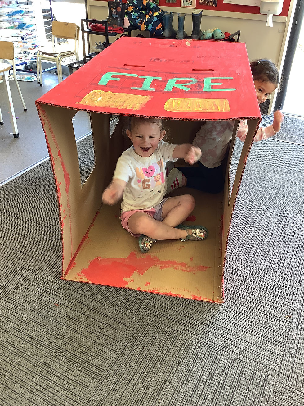 We love role play in the Mānuka room! We were lucky to get a new washing machine for the centre and we had lots of fun making a fire truck out of the box! This was a fun experience, first painting the whole box red, waiting for that to dry, and then painting some wheels and lights on it! Once it was all dry we cut out some windows and then it was time to play! This has been a huge hit with the tamariki, who spend all day going in and out of the fire truck with their friends!