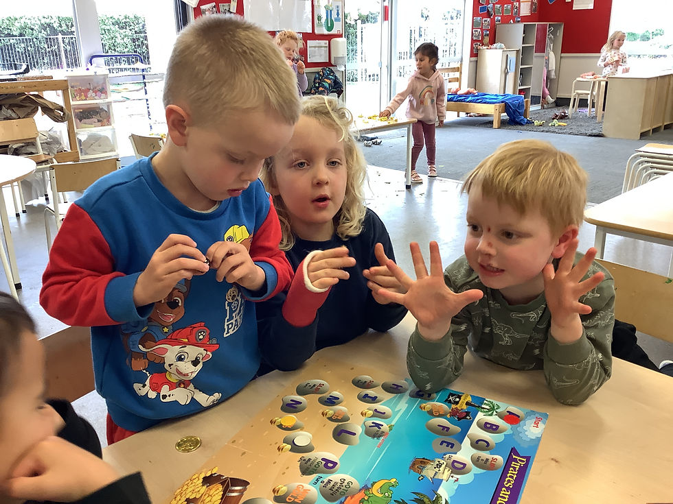 There are spaces along the board with the letters of the alphabet on them, as well as spaces where the tamariki can collect gold coins, miss a turn or have to travel to an island that is on the board. The tamariki love to play this game with their peers! Each time they play this game, they develop their letter recognition skills as we talk about what letter they have landed. They also develop their sharing and turn taking skills as the tamariki patiently wait for their turn as their friends are taking their turns.